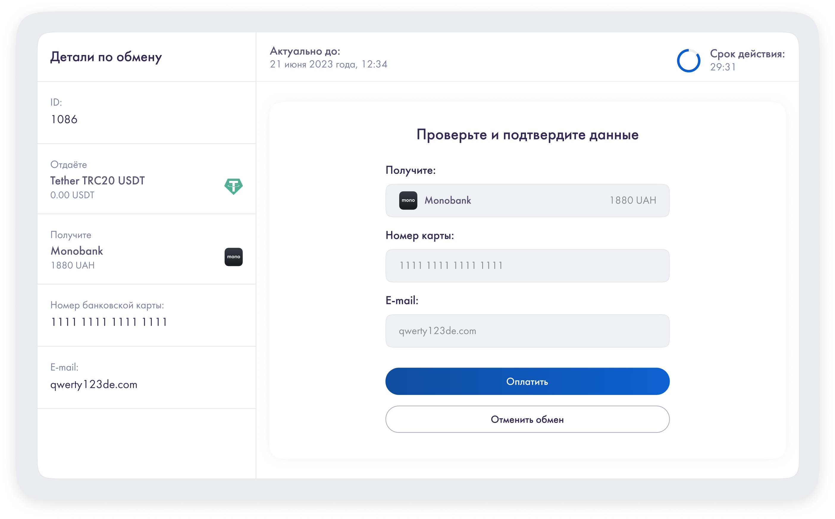 После этого проверяем все данные, сумму которую мы получаем, реквизиты, и если все верно нажимаем кнопку “Оплатить”