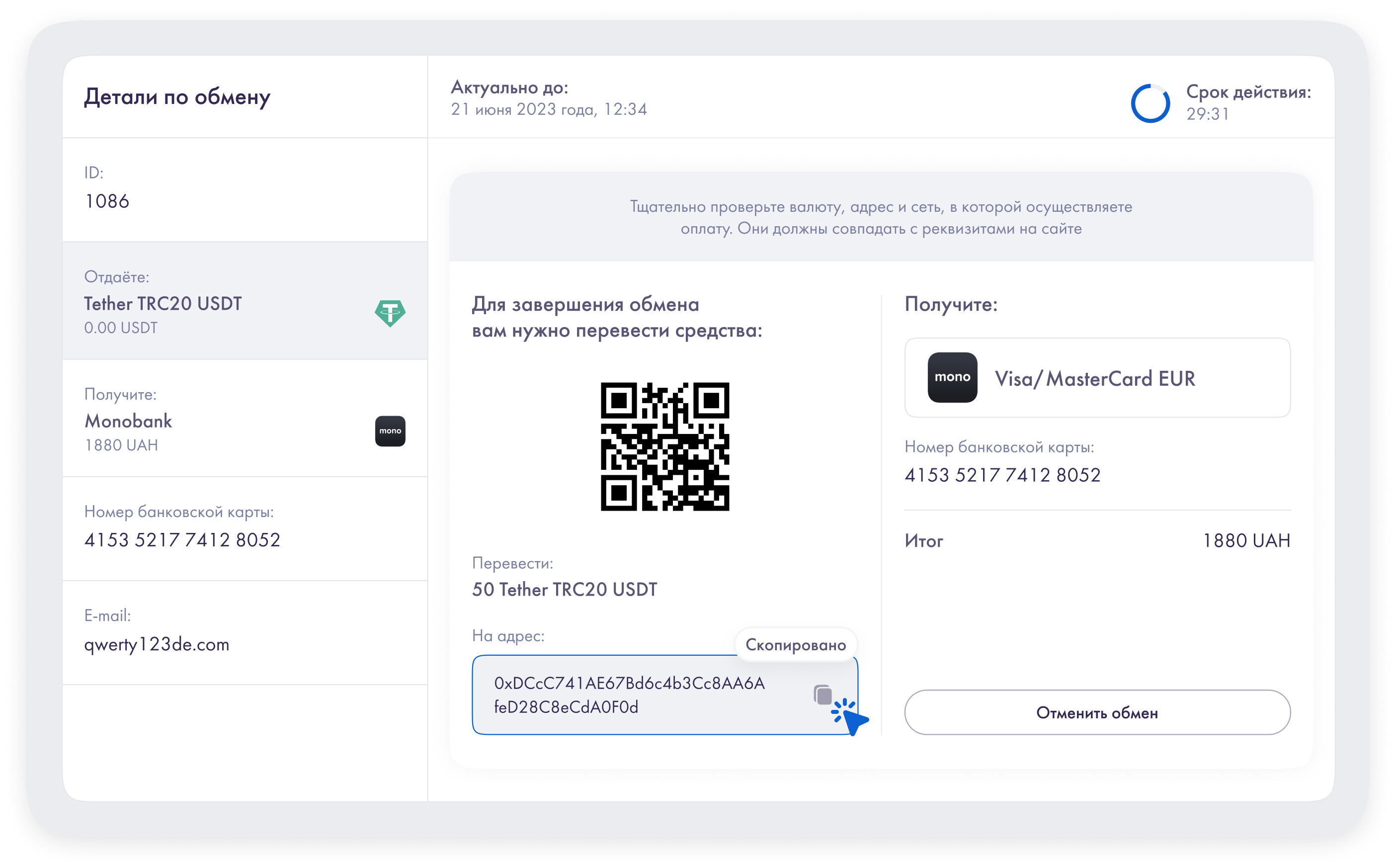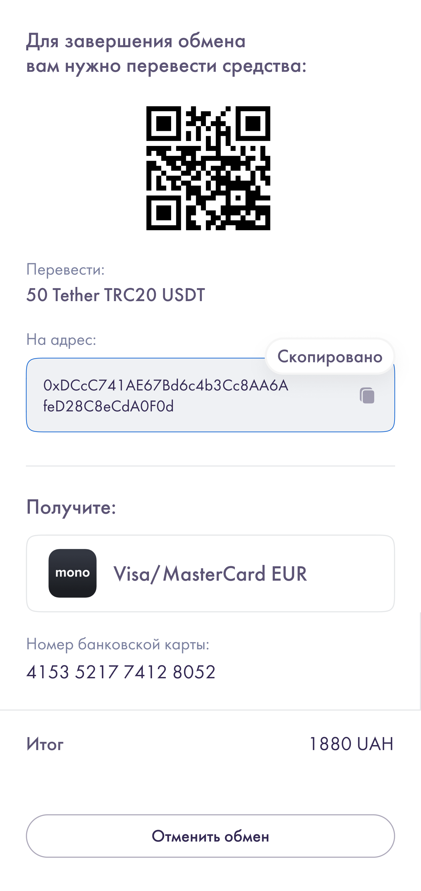 На странице оплаты мы видим реквизиты, необходимо их скопировать и перевести на них криптовалюту.