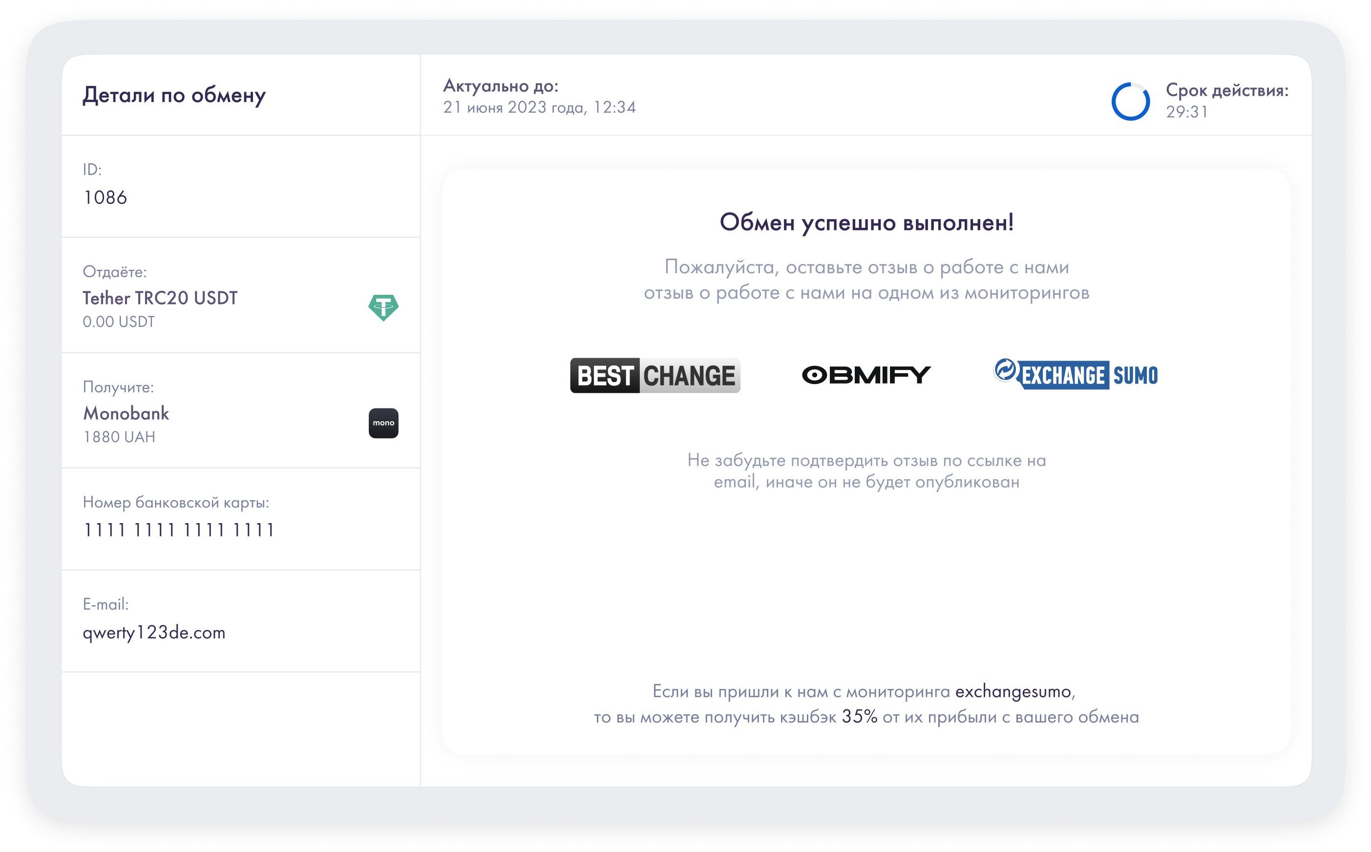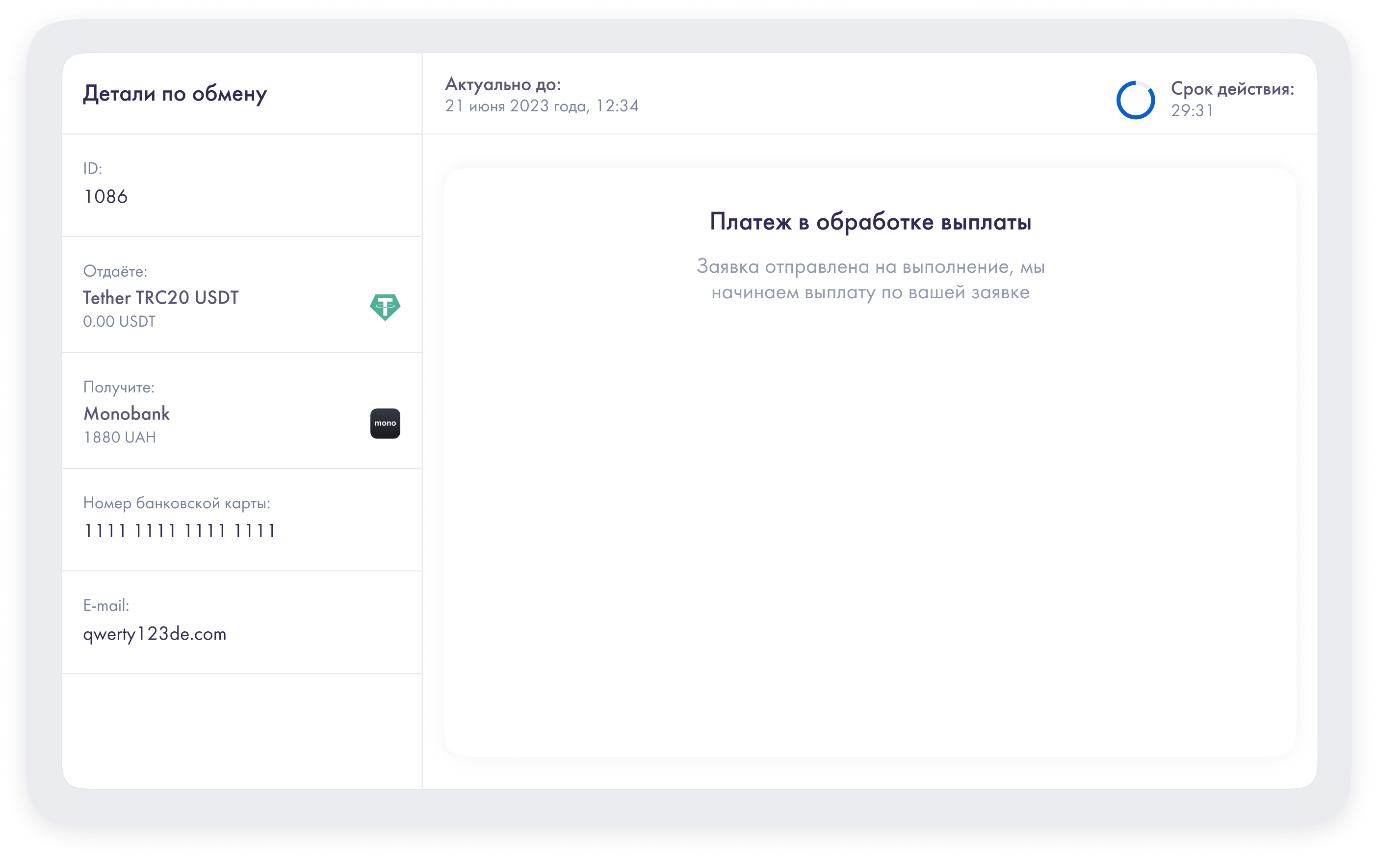 После оплаты необходимо ожидать поступление криптовалюты, это занимает от 2х минут и больше, в зависимости от криптовалюты и сети вывода.